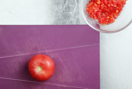 2. За это время очистить перцы и помидоры от внутренностей, а мякоть нарезать такими же мелкими кубиками, как до того баклажаны и лук. Чеснок и петрушку мелко нарубить.