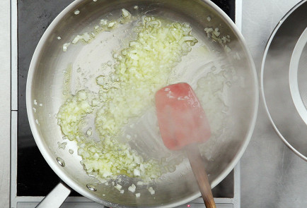 3. Разогреть в сковородке часть оливкового масла, обжарить до мягкости лук и откинуть его на дуршлаг.