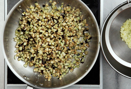4. Добавить в сковороду немного масла, обжарить на нем до мягкости предварительно отжатые от лишней жидкости кубики баклажанов. Обжаренные баклажаны откинуть на дуршлаг. Теперь осталось обжарить все на том же масле кубики перца и тоже откинуть их на дуршлаг.