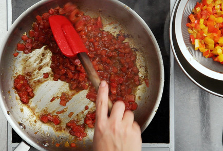 5. Долить в сковороду оставшееся масло, обжарить чеснок до мягкости, тут же добавить томатную пасту и щепотку сахара, а потом сразу помидоры. Тушить тридцать секунд, после чего вмешать все ранее обжаренные овощи и рубленую петрушку, посолить, поперчить, потомить минуту — и снять с огня.