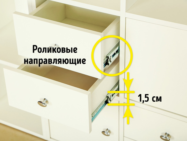 У обоих направляющих ширина должна быть не менее 1 см, тогда у ящиков не будет проблем с открыванием и прослужат они дольше. С любым типом направляющих ящики должны выдвигаться свободно, независимо от степени заполненности. Чтобы проверить модель, можно положить внутрь ящика что-то тяжелое, а потом открыть и закрыть его.