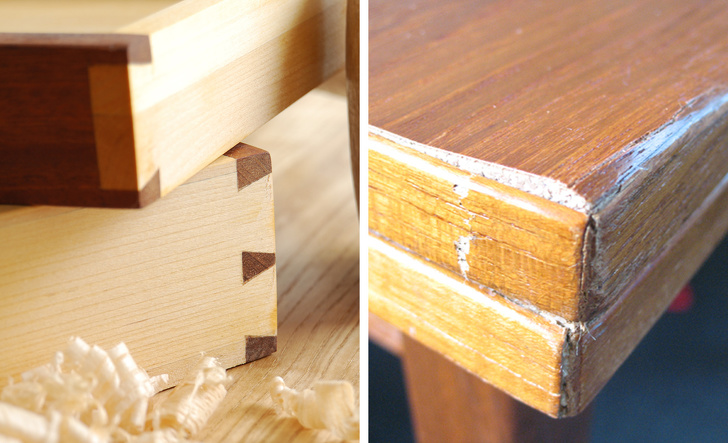 Все стыки должны быть гладкими и ровными, без необработанных спилов и срезов. Края стыков должны плотно прилегать друг к другу, чтобы не было зазоров и следов клея. Для проверки можно использовать любой достаточно тонкий предмет, например зубочистку. Если она свободно проходит в зазор между стыками — выбирать такую мебель не стоит.