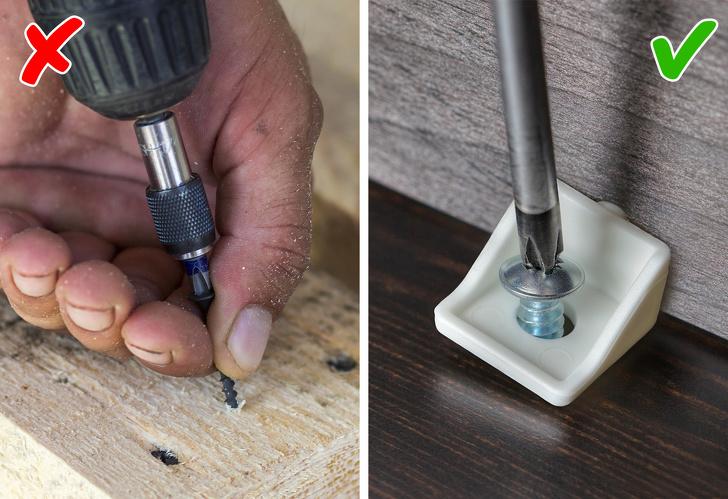 Фурнитура — это все дополнительные детали: уголки, стяжки, пряжки, ножки. Они делают мебель крепче и улучшают ее внешний вид. Вся фурнитура должна быть плотно закреплена, между ней и материалом не должно быть зазоров. При правильном закреплении поверхность вокруг будет гладкой, без вмятин и следов деформации.